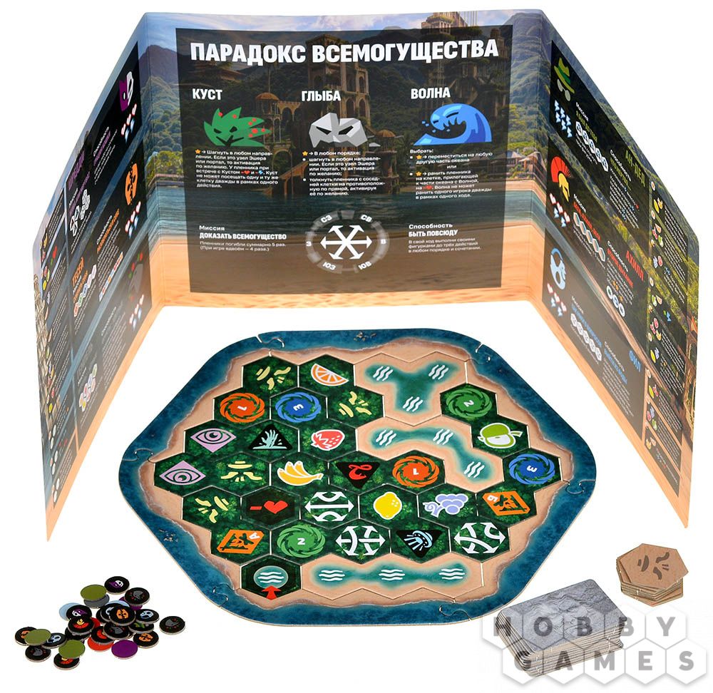 Когда пленники совершат свои ходы, действовать начнёт Парадокс Всемогущества! Да, он тоже хочет выбраться с острова, а потому игрок за Парадокс всеми силами будет мешать остальным героям. У него есть собственные фигурки, его воплощения на острове: Куст, Глыба и Волна, между которыми он распределяет 3 своих действия. Волна может ранить пленника, находящегося на клетке рядом с океаном. Куст может передвинуться на одну клетку в любом направлении и ранить пленников там, где остановился, а Глыба может толкнуть героя, стоящего с ней на соседней клетке.