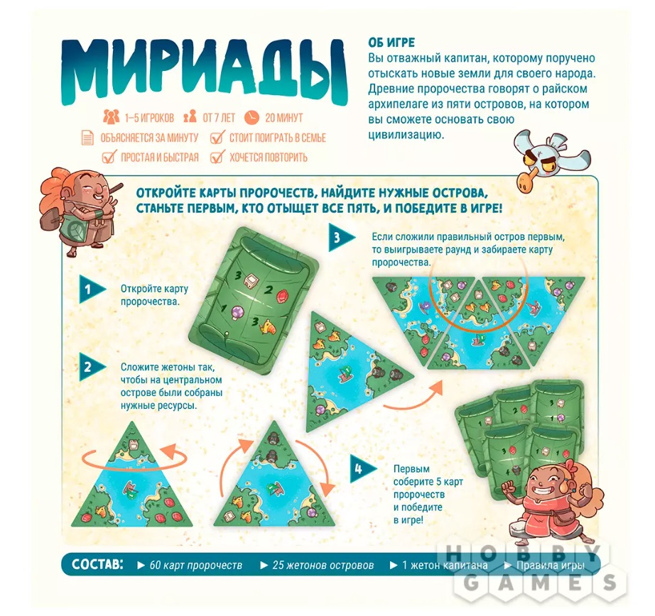 Настолка крайне простая для освоения. Подойдёт для игры в компании друзей или семьи, даже если они совсем ещё новички в этом виде развлечений. Действия игры "Мириады" разворачиваются посреди океана. В роли капитана корабля вам предстоит покорить новые земли. Отправляйтесь в плавание как в компании друзей, так и в одиночку. Соревнуясь с другими капитанами, вам требуется найти нужные острова быстрее других.