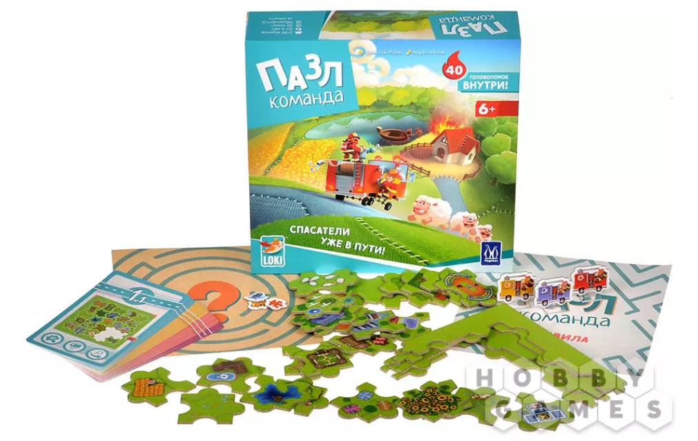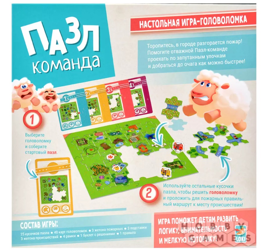 "Пазл-команда" – это настольная игра для детей, в которой игрокам предстоит решать головоломки, правильно складывая детали пазла. Им необходимо проложить маршрут пожарной машины до места происшествия, но чем дальше будут решаться головоломки, тем сложнее это будет сделать. Это кооперативная игра, так что решать головоломку могут неограниченное число игроков! А это значит, что помимо логического и пространственного мышления, игра благотворно влияет и на навыки общения юных игроков, ведь нельзя работать в команде, не обсуждая свои мысли!